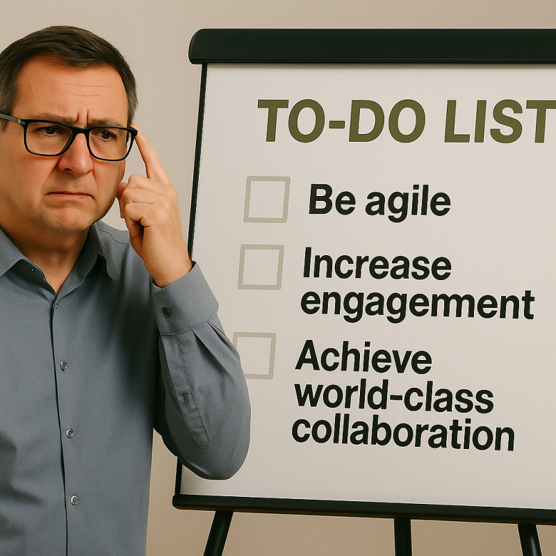 Så næste gang du får lyst til at sige “vi skal være mere agile”, “mere engagerede”, “bedre til at samarbejde”…